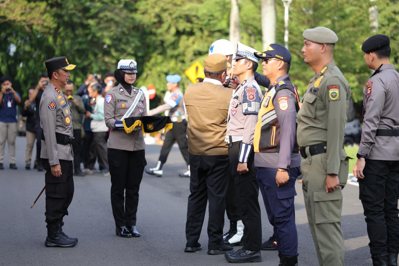Dalam kegiatan tersebut, Kapolda Sumsel bersama unsur Forkopimda turut melakukan penyematan pita Operasi Ketupat Musi 2026 kepada perwakilan personel sebagai simbol dimulainya operasi pengamanan Lebaran secara resmi.